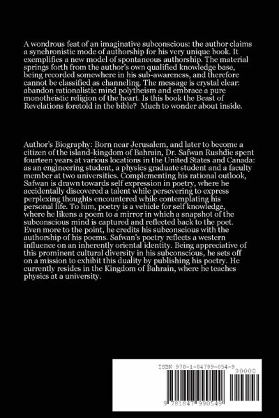 A wondrous feat of an imaginative subconscious: the author claims a synchronistic mode of authorship for his very unique book. It exemplifies a new model of spontaneous authorship. The material springs forth from the author's own qualified knowledge base, being recorded somewhere in his sub-awareness, and therefore cannot be classified as channeling. The message is crystal clear: abandon rationalistic mind polytheism and embrace a pure monotheistic religion of the heart. Is this book the Beast of Revelations foretold in the bible? Much to wonder about inside.