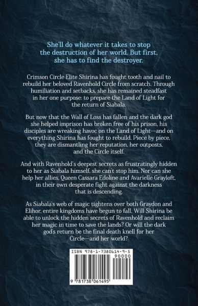 She'll do whatever it takes to stop the destruction of her world. But first, she has to find the destroyer. Crimson Circle Elite Shirina has fought tooth and nail to rebuild her beloved Ravenhold Circle from scratch. Through humiliation and setbacks, she has remained steadfast in her one purpose: to prepare the Land of Light for the return of Siabala. But now that the Wall of Loss has fallen and the dark god she helped imprison has broken free of his prison, his disciples are wreaking havoc on the Land of Light-and on everything Shirina has fought to rebuild. Piece by piece, they are dismantling her reputation, her outposts, and the Circle itself. And with Ravenhold's deepest secrets as frustratingly hidden to her as Siabala himself, she can't stop him. Nor can she help her allies, Queen Cassara Edoline and Avarielle Grayloft, in their own desperate fight against the darkness that is descending. As Siabala's web of magic tightens over both Graydon and Elihor, entire kingdoms have begun to fall. Will Shirina be able to unlock the hidden secrets of Ravenhold and reclaim her magic in time to save the lands? Or will the dark god's return be the final death knell for her Circle-and her world?