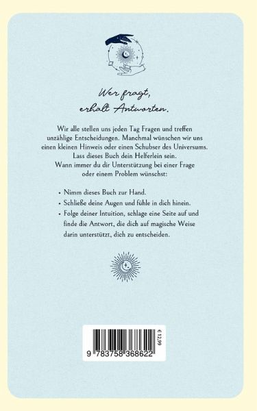 Wir alle stellen uns jeden Tag Fragen und treffen unzählige Entscheidungen. Manchmal wünschen wir uns einen kleinen Hinweis oder einen Schubser des Universums. Lass dieses Buch dein Helferlein sein. Wann immer du dir Unterstützung bei einer Frage oder einem Problem wünschst: - Nimm das Buch zur Hand. - Schließe deine Augen und fühle in dich hinein. - Folge deiner Intuition, schlage eine Seite auf und finde die Antwort, nach der du gesucht hast.