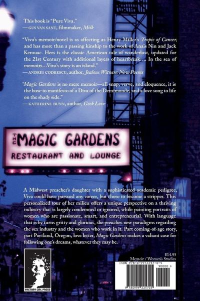 A midwest preacher's daughter with a sophisticated academic pedigree, Viva could have pursued any career, but chose to become a stripper. This personalized tour of her milieu offers a unique perspective on a thriving industry that is largely condemned or ignored, while painting portraits of women who are passionate, smart, and entrepreneurial. With language that is by turns gritty and glorious, she preaches new paradigms regarding the sex industry and the women who work in it. Part coming-of-age story, part Portland, Oregon, love letter, Magic Gardens makes a valiant case for following one's dreams, whatever they may be.