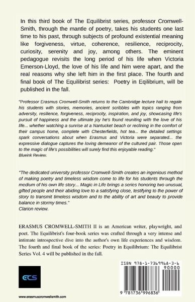 In this third book of The Equilibrist series, Professor Cromwell-Smith, through the mantle of poetry, takes his students one last time to his past, through subjects of profound existential meaning like forgiveness, virtue, coherence, resilience, reciprocity, curiosity, serenity and joy, among others. The eminent pedagogue revisits the long period of his life when Victoria Emerson-Lloyd, the love of his life and him were apart, and the real reasons why she left him in the first place. The fourth and final book of The Equilibrist series: Poetry in Equilibrium will be published in the fall. "Professor Erasmus Cromwell-Smith returns to the Cambridge lecture hall to regale his students with stories, memories, ancient scribbles with topics ranging from adversity, resilience, forgiveness, reciprocity, inspiration, and joy, showcasing life's pursuit of happiness and the ultimate joy he's found reuniting with the love of his life... whether watching a sunrise at a Nantucket beach or reclining in the comfort of their campus home, complete with Chesterfields, hot tea... the detailed settings spark conversations about when Erasmus and Victoria were separated... the expressive dialogue captures the loving demeanor of the cultured pair. Those open to the magic of life's possibilities will surely find this enjoyable reading." Blueink Review. "The dedicated university Professor Cromwell-Smith creates an ingenious method of making poetry and timeless wisdom come to life for his students through the medium of his own life story... Magic in Life brings a series honoring two unusual, gifted people and their abiding love to a satisfying close, testifying to the power of story to transmit timeless wisdom and to the ability of art and beauty to provide balance in stormy times." Clarion review. "I'd have to say that The Equilibrist is perhaps the most inspirational, intellectually & emotionally rewarding book I've ever performed." Daniel Dorse (the voice behind The Equilibrist series' audiobooks).