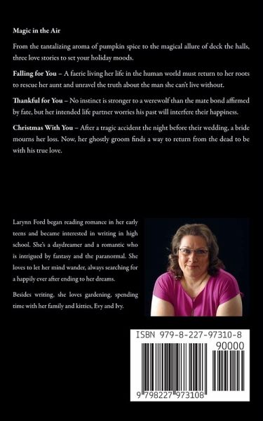 Magic in the Air From the tantalizing aroma of pumpkin spice to the magical allure of deck the halls, three love stories to set your holiday moods. Falling for You - A faerie living her life in the human world must return to her roots to rescue her aunt and unravel the truth about the man she can't live without. Thankful for You - No instinct is stronger to a werewolf than the mate bond affirmed by fate, but her intended life partner worries his past will interfere their happiness. Christmas With You - After a tragic accident the night before their wedding, a bride mourns her loss. Now, her ghostly groom finds a way to return from the dead to be with his true love.