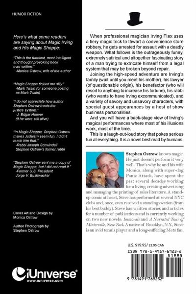 When professional magician Irving Flax uses a fiery magic trick to thwart a convenience store robbery, he gets arrested for assault with a deadly weapon. What follows is the outrageously funny, extremely satirical and altogether fascinating story of a man trying to extricate himself from a legal system that may be broken beyond repair. Joining the high-speed adventure are Irving's family (wait until you meet his mother), his lawyer (of questionable origin), his benefactor (who will resort to anything to increase his fortune), his rabbi (who wants to have Irving excommunicated), and a variety of savory and unsavory characters, with special guest appearances by a host of show business personalities. And you will have a back-stage view of Irving's magical performances where most of his illusions work, most of the time. This is a laugh-out-loud story that pokes serious fun at everything. It is a novel best read by humans. Here's what some readers are saying about Magic Irving and His Magic Shoppe: "This is the funniest, most intelligent and thought provoking book ever written." -Monica Ostrow, wife of the author "Magic Shoppe tickled me silly." -Mark Twain (or someone posing as Mark Twain) "I do not appreciate how author Stephen Ostrow treats the justice system." -J. Edgar Hoover (if he were still alive) "In Magic Shoppe, Stephen Ostrow makes Judaism seem fun. I didn't teach him that." -Rabbi Joseph Schwindall Stephen Ostrow's former rabbi "Stephen Ostrow sent me a copy of Magic Shoppe, but I did not read it." -Former U.S. President Jorge V. Bushwacker