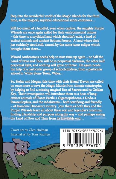 Step into the wonderful world of the Magic Islands for the third time, as the magical, mystical educational series continues... Still too much of a handful, even when captive, the naughty Purple Wizards are once again exiled for their environmental crimes - this time to a mythical land which shouldn't exist, a land of extinct animals and ancient fictional beasts. A land where time has suddenly stood still, caused by the same lunar eclipse which brought them there... Wizard Ambrosious needs help to start time up again - or half the Land of Now and Then will be in perpetual darkness, the other half perpetual light, and nothing will grow or thrive. He again needs the help of a particular group of schoolchildren, from a particular school in White Stone Town, Wales... So, Stefan and Megan, this time with their friend Trevor, are called on once more to save the Magic Islands from climate catastrophe, by helping to find a missing magical Box of Secrets and its Golden Key. Their investigation will introduce them to a host of long-extinct animals of Planet Earth: a Gigantopithecus, a Dodo, a Parasaulophus, and the inhabitants - both terrifying and friendly - of fearsome Dinosaur Country. Join them as both they and the Purple Wizards learn all about these real and legendary creatures, finding friendship and purpose along the way - and perhaps saving the Land of Now and Then from its inevitable end...