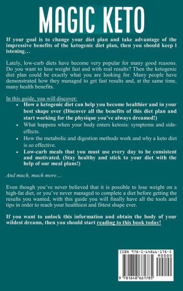 If your goal is to change your diet plan and take advantage of the impressive benefits of the ketogenic diet plan, then you should keep listening... Lately, low-carb diets have become very popular for many good reasons. Do you want to lose weight fast and with real results? Then the ketogenic diet plan could be exactly what you are looking for. Many people have demonstrated how they managed to get fast results and, at the same time, many health benefits. In this guide, you will discover:How a ketogenic diet can help you become healthier and in your best shape ever (Discover all the benefits of this diet plan and start working for the physique you've always dreamed!) What happens when your body enters ketosis: symptoms and side-effects. How the metabolic and digestion methods work and why a keto diet is so effective. Low-carb meals that you must use every day to be consistent and motivated. (Stay healthy and stick to your diet with the help of our meal plans!) And much, much more... Even though you've never believed that it is possible to lose weight on a high-fat diet, or you've never managed to complete a diet before getting the results you wanted, with this guide you will finally have all the tools and tips in order to reach your healthiest and fittest shape ever. If you want to unlock this information and obtain the body of your wildest dreams, then you should start reading to this book today!