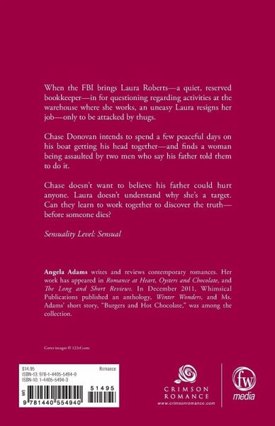 When the FBI brings Laura Roberts - a quiet, reserved bookkeeper - in for questioning regarding activities at the warehouse where she works, an uneasy Laura resigns her job - only to be attacked by thugs. Chase Donovan intends to spend a few peaceful days on his boat getting his head together - and finds a woman being assaulted by two men who say his father told them to do it. Chase doesn't want to believe his father could hurt anyone. Laura doesn't understand why she's a target. Can they learn to work together to discover the truth - before someone dies? Sensuality Level: Sensual