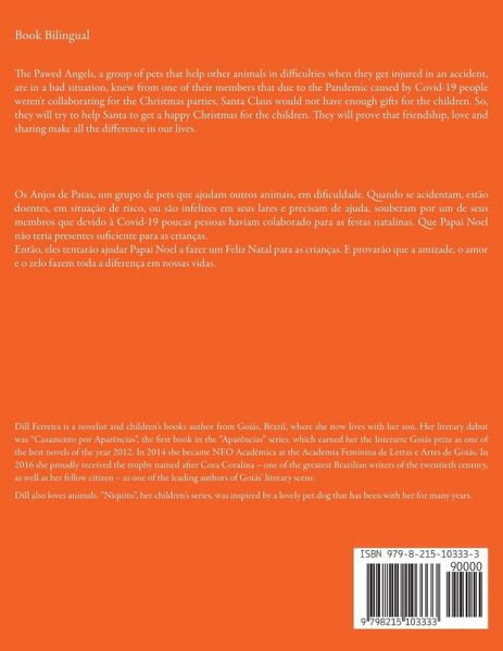 Book Bilingual The Pawed Angels, a group of pets that help other animals in difficulties when they get injured in an accident, are in a bad situation, knew from one of their members that due to the Pandemic caused by Covid-19 people weren't collaborating for the Christmas parties, Santa Claus would not have enough gifts for the children. So, they will try to help Santa to get a happy Christmas for the children. They will prove that friendship, love and sharing make all the difference in our lives. Os Anjos de Patas, um grupo de pets que ajudam outros animais, em dificuldade. Quando se acidentam, estão doentes, em situação de risco, ou são infelizes em seus lares e precisam de ajuda, souberam por um de seus membros que devido à Covid-19 poucas pessoas haviam colaborado para as festas natalinas. Que Papai Noel não teria presentes suficiente para as crianças. Então, eles tentarão ajudar Papai Noel a fazer um Feliz Natal para as crianças. E provarão que a amizade, o amor e o zelo fazem toda a diferença em nossas vidas.