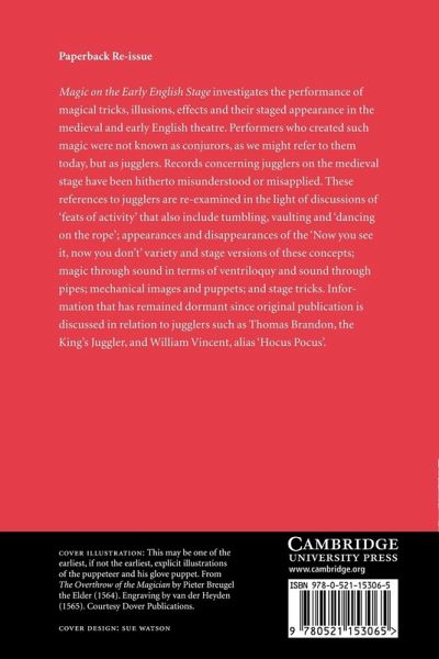 Magic on the Early English Stage investigates the performance of magical tricks, illusions, effects and their staged appearance in the medieval and early English theatre. Performers who created such magic were not known as conjurors, as we might refer to them today, but as jugglers. Records concerning jugglers on the medieval stage have been hitherto misunderstood or misapplied. These references to jugglers are re-examined in the light of discussions of 'feats of activity' that also include tumbling, vaulting and 'dancing on the rope'; appearances and disappearances of the 'Now you see it, now you don't' variety; and stage versions of these concepts; magic through sound in terms of ventriloquy and sound through pipes; mechanical images and puppets; and stage tricks. Information that has remained dormant since original publication is discussed in relation to jugglers such as Thomas Brandon, the King's Juggler, and William Vincent, alias 'Hocus Pocus'.