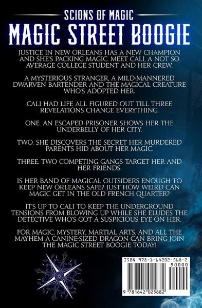 Justice in New Orleans has a new champion and she's packing magic. Meet Cali, a not so average college student and her crew.A mysterious stranger, a mild-mannered Dwarven bartender and the magical creature who's adopted her.Cali had life all figured out till three revelations change everything.One. An escaped prisoner shows her the underbelly of her city.Two. She discovers the secret her murdered parents hid about her magic.Three. Two competing gangs target her and her friends.Is her band of magical outsiders enough to keep New Orleans safe? Just how weird can magic get in the old French Quarter?It's up to Cali to keep the underground tensions from blowing up while she eludes the detective who's got a suspicious eye on her.For magic, mystery, martial arts, and all the mayhem a canine-sized dragon can bring join the Magic Street Boogie today!Click the Buy Now button and read it today.