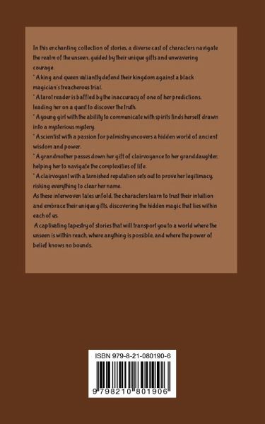 In this enchanting collection of stories, a diverse cast of characters navigates the realm of the unseen, guided by their unique gifts and unwavering courage. * A king and queen valiantly defend their kingdom against a black magician's treacherous trial. * A tarot reader is baffled by the inaccuracy of one of her predictions, leading her on a quest to discover the truth. * A young girl with the ability to communicate with spirits finds herself drawn into a mysterious mystery. * A scientist with a passion for palmistry uncovers a hidden world of ancient wisdom and power. * A grandmother passes down her gift of clairvoyance to her granddaughter, helping her to navigate the complexities of life. * A clairvoyant with a tarnished reputation sets out to prove her legitimacy, risking everything to clear her name. As these interwoven tales unfold, the characters learn to trust their intuition and embrace their unique gifts, discovering the hidden magic that lies within each of us. A captivating tapestry of stories that will transport you to a world where the unseen is within reach, where anything is possible, and where the power of belief knows no bounds.