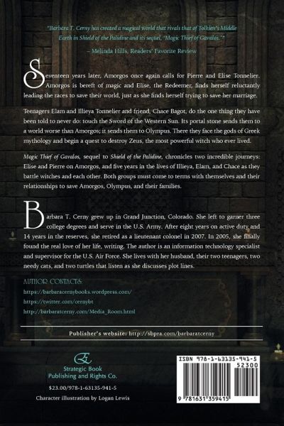 "Barbara T. Cerny has created a magical world that rivals that of Tolkien's Middle Earth in Shield of the Palidine and its sequel, 'Magic Thief of Gavalos.'" - Melinda Hills, Readers' Favorite Review Seventeen years later, Amorgos once again calls for Pierre and Elise Tonnelier. Amorgos is bereft of magic and Elise, the Redeemer, finds herself reluctantly leading the races to save their world, just as she finds herself trying to save her marriage. Teenagers Elam and Illieya Tonnelier and friend, Chace Bagot, do the one thing they have been told to never do: touch the Sword of the Western Sun. Its portal stone sends them to a world worse than Amorgos; it sends them to Olympus. There they face the gods of Greek mythology and begin a quest to destroy Zeus, the most powerful witch who ever lived. Magic Thief of Gavalos, sequel to Shield of the Palidine, chronicles two incredible journeys: Elise and Pierre on Amorgos, and five years in the lives of Illieya, Elam, and Chace as they battle witches and each other. Both groups must come to terms with themselves and their relationships to save Amorgos, Olympus, and their families. Barbara T. Cerny grew up in Grand Junction, Colorado. She left to garner three college degrees and serve in the U.S. Army. After eight years on active duty and 14 years in the reserves, she retired as a lieutenant colonel in 2007. In 2005, she finally found the real love of her life, writing. The author is an information technology specialist and supervisor for the U.S. Air Force. She lives with her husband, their two teenagers, two needy cats, and two turtles that listen as she discusses plot lines. Author contacts: https://barbaracernybooks.wordpress.com/ https://twitter.com/cernybt http://barbaratcerny.com/Media_Room.html Publisher's website: http://sbpra.com/barbaratcerny