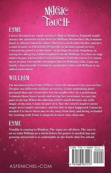 ESME I never dreamed my small curatives shop in Windsor, England would attract the attention of war hero Sir William Meriwether. My feminine heart is aflutter when he enters. But I'm a witch and a healer, and he's a man in pain, so I heal him. Desperate to do him a good service, I stretch my powers to the limit-or perhaps beyond. Somehow, in curing his ailing leg, I unleash powers inside William. At a loss to stop what's begun, I'm forced to seek assistance from the coven I've sworn never to join. I dread the encounter, but for William's sake, I put my family's hatred aside. Getting to spend more time with William is an added enticement. WILLIAM I'm mesmerized by Esme O'Dwyer from the moment I lay eyes on her. Despite our different stations in society, I want something more personal than any restorative tea she might offer. As a gentleman, I contain those baser needs and accept her assistance to ease the pain in my leg. When the alluring witch's touch bestows me with magic of my own, I want no part of it. But the coven's leaders insist magic never makes mistakes, and for this to have happened, I must be needed. I've never been one to shy away from duty, and being secluded for training with Esme is magical in more ways than one. ESME Trouble is coming to Windsor. The signs are all there. The race is on to train William as a witch before his power is needed, but our growing attraction is as undeniable as the battle that lies ahead.