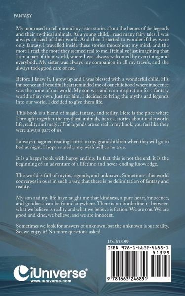 My mom used to tell us, to me and my sister, stories about the heroes of the legends and their mythical animals. As a young child, I read many fairy tales. I was always amazed of their world. And then I started to wonder if they were only fantasy. I travelled inside these stories throughout my mind, and the more I read, the more they seemed real to me. I felt alive just imagining that I am a part of their world, where I was always welcomed by everything and everybody. My sister was always my companion in all my travels, and she always took good care of me. Before I knew it, I grew up and I was blessed with a wonderful child. His innocence and beautiful heart reminded me of our childhood where innocence was the name of our world. My son was and is an inspiration for a fantasy world of my own. Just for my him, I decided to bring the myths and legends into our world. I decided to give them life. This book is a blend of magic, fantasy, and reality. Here is the place where I brought together the mythical animals, heroes, stories about underworld life, reality and magic. The legends are so real in my book, you feel like they were always part of us. I always imagined reading stories to my grandchildren when they will go to bed at night. I hope someday my wish will come true. It is a happy book with happy ending. In fact, this is not the end, it is the beginning of an adventure of a lifetime and never-ending knowledge.