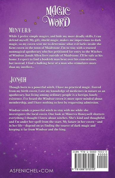 MINERVA While I prefer simple magics, and hide my more deadly skills, I can defend myself. My gift, shield magic, makes me impervious to dark magic, so my coven sent me to determine what evil lurks inside the Kent coven in the town of Maidstone. I'm to stay with a trusted nonmagical apothecary who has petitioned for entry to the Witches of Windsor. Jonah Allen lives outside of Maidstone. I'll be safe at his home. I expect to find a bookish man bent over his concoctions, but instead, I find a hulking bear of a man who stimulates more than my intellect... JONAH Though born to a powerful witch, I have no practical magic. Forced from my birth coven, I use my knowledge of medicines in nature as an apothecary, but living among ordinary people is a foreign, lonely existence. I've heard the Windsor coven is more open-minded about membership, and I have nothing to lose by requesting admission. Windsor sends a powerful witch to stay with me while she investigates the local coven. One look at Minerva Honeywell shatters everything I thought I knew about witches. She's kind and thoughtful, and I'm under her spell from the start. My future in her coven-and in her life-depend on us finding the source of dark magic and keeping it far from Windsor and the king.