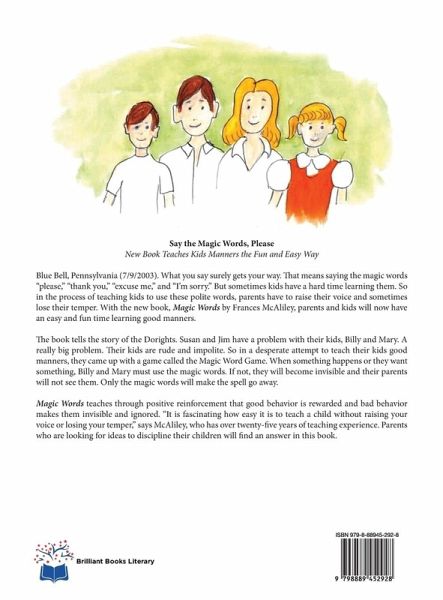 Say the Magic Words, Please New Book Teaches Kids Manners the Fun and Easy Way Blue Bell, Pennsylvania (7/9/2003). What you say surely gets your way. That means saying the magic words "please," "thank you," "excuse me," and "I'm sorry." But sometimes kids have a hard time learning them. So in the process of teaching kids to use these polite words, parents have to raise their voice and sometimes lose their temper. With the new book, Magic Words by Frances McAliley, parents and kids will now have an easy and fun time learning good manners. The book tells the story of the Dorights. Susan and Jim…mehr