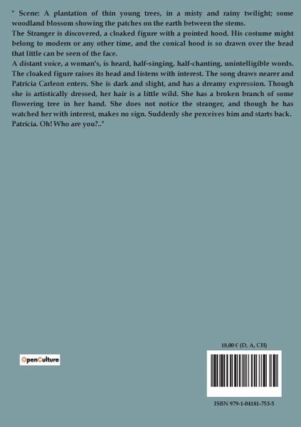 " Scene: A plantation of thin young trees, in a misty and rainy twilight; some woodland blossom showing the patches on the earth between the stems. The Stranger is discovered, a cloaked figure with a pointed hood. His costume might belong to modern or any other time, and the conical hood is so drawn over the head that little can be seen of the face. A distant voice, a woman's, is heard, half-singing, half-chanting, unintelligible words. The cloaked figure raises its head and listens with interest. The song draws nearer and Patricia Carleon enters. She is dark and slight, and has a dreamy expression. Though she is artistically dressed, her hair is a little wild. She has a broken branch of some flowering tree in her hand. She does not notice the stranger, and though he has watched her with interest, makes no sign. Suddenly she perceives him and starts back. Patricia. Oh! Who are you?.."