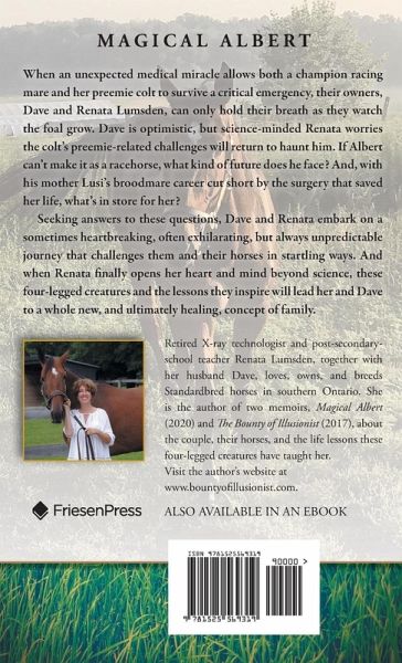 When an unexpected medical miracle allows both a champion racing mare and her preemie colt to survive a critical emergency, their owners, Dave and Renata Lumsden, can only hold their breath as they watch the foal grow. Dave is optimistic, but science-minded Renata worries the colt's preemie-related challenges will return to haunt him. If Albert can't make it as a racehorse, what kind of future does he face? And, with his mother Lusi's broodmare career cut short by the surgery that saved her life, what's in store for her? Seeking answers to these questions, Dave and Renata embark on a sometimes heartbreaking, often exhilarating, but always unpredictable journey that challenges them and their horses in startling ways. And when Renata finally opens her heart and mind beyond science, these four-legged creatures and the lessons they inspire will lead her and Dave to a whole new, and ultimately healing, concept of family.