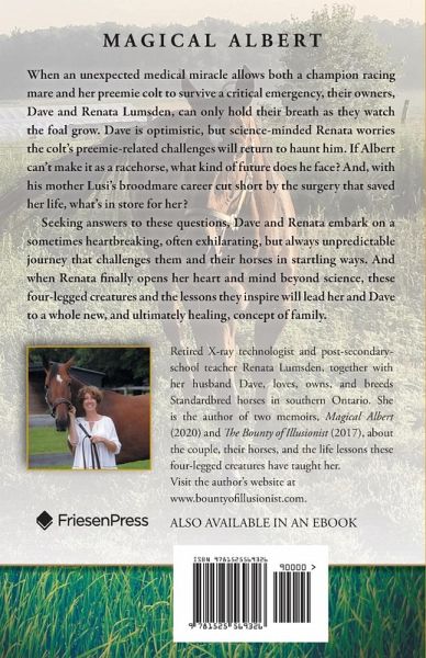 When an unexpected medical miracle allows both a champion racing mare and her preemie colt to survive a critical emergency, their owners, Dave and Renata Lumsden, can only hold their breath as they watch the foal grow. Dave is optimistic, but science-minded Renata worries the colt's preemie-related challenges will return to haunt him. If Albert can't make it as a racehorse, what kind of future does he face? And, with his mother Lusi's broodmare career cut short by the surgery that saved her life, what's in store for her? Seeking answers to these questions, Dave and Renata embark on a sometimes heartbreaking, often exhilarating, but always unpredictable journey that challenges them and their horses in startling ways. And when Renata finally opens her heart and mind beyond science, these four-legged creatures and the lessons they inspire will lead her and Dave to a whole new, and ultimately healing, concept of family.
