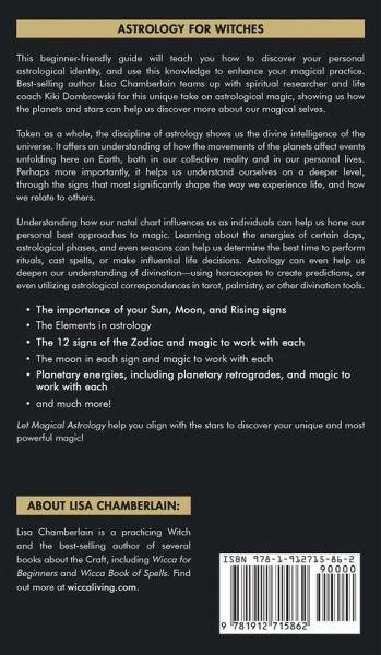 Astrology for Witches This beginner-friendly guide will teach you how to discover your personal astrological identity, and use this knowledge to enhance your magical practice. Best-selling author Lisa Chamberlain teams up with spiritual researcher and life coach Kiki Dombrowski for this unique take on astrological magic, showing us how the planets and stars can help us discover more about our magical selves. Understanding how our natal chart influences us as individuals can help us hone our personal best approaches to magic. Learning about the energies of certain days, astrological phases, and even seasons can help us determine the best time to perform rituals, cast spells, or make influential life decisions. Astrology can even help us deepen our understanding of divination-using horoscopes to create predictions, or even utilizing astrological correspondences in tarot, palmistry, or other divination tools. This guide covers: The importance of your Sun, Moon, and Rising signs The Elements in astrology The 12 signs of the Zodiac and magic to work with each The moon in each sign and magic to work with each Planetary energies, including planetary retrogrades, and magic to work with each and much more!