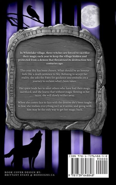 In Whitelake village, three witches are forced to sacrifice their magic each year to keep the village hidden and protected from a demon that threatened its destruction two centuries ago. This year Sky has been chosen. What should be an honour feels like a death sentence to Sky. Refusing to accept her reality, she asks the Fates for guidance and embarks on a journey to reclaim what's been taken. Her quest leads her to meet others who have had their magic sacrificed, and she learns that without magic flowing in her veins, she will slowly wither away. When she comes face to face with the demon she's been taught to fear, she realises everything isn't as it seems, and going with him may be the only way to get her magic back.