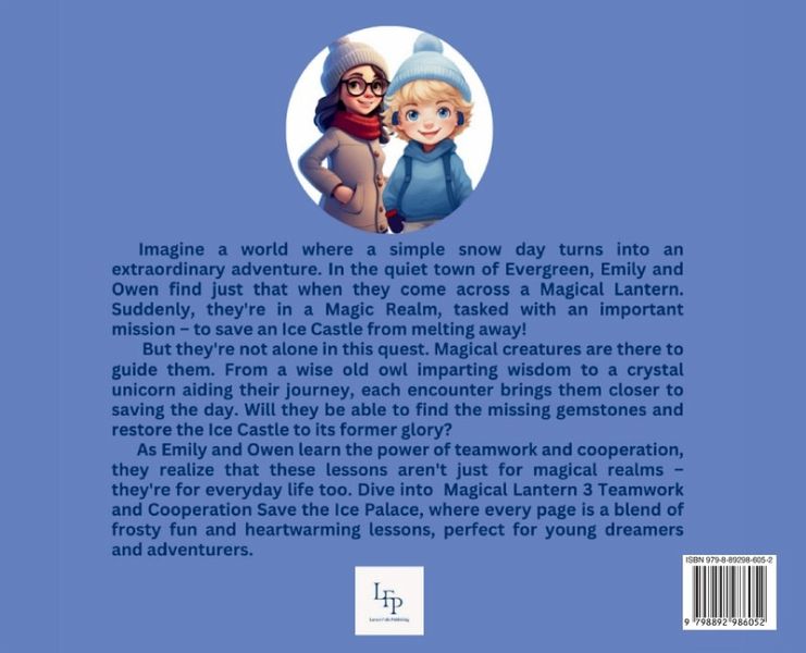Get ready for a snowy adventure in Evergreen! In Magical Lantern 3 Teamwork and Cooperation Save the Ice Palace, join Emily, Owen, and their brother Nate on an unexpected snow day filled with fun, challenges, and a magical journey. When Emily and Owen discover a Magical Lantern in the town gazebo, they are whisked away to a frosty Magic Realm. Here, the Ice Castle is in peril, and only they can save it! With the help of new friends like Shadow the Elf, a wise old owl, and a crystal unicorn, Emily and Owen embark on a quest to find missing gemstones to keep the castle from melting. Each gem they find teaches them a valuable lesson about teamwork and cooperation. But can they find all the stones in time and bring the lessons learned back to their own world? Magical Lantern 3 Teamwork and Cooperation Save the Ice Palace is not just a story about a magical adventure; it's a journey into understanding the importance of helping and working together. Perfect for young readers who love a mix of fantasy and real-world lessons, this book will leave them dreaming of their own magical quests.