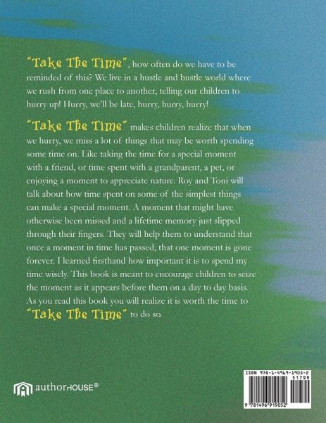 "Take The Time", how often do we have to be reminded of this? We live in a hustle and bustle world where we rush from one place to another, telling our children to hurry up! Hurry, we'll be late, hurry, hurry, hurry! "Take The Time" makes children realize that when we hurry, we miss a lot of things that may be worth spending some time on. Like taking the time for a special moment with a friend, or time spent with a grandparent, a pet, or enjoying a moment to appreciate nature. Roy and Toni will talk about how time spent on some of the simplest things can make a special moment. A moment that might have otherwise been missed and a lifetime memory just slipped through their fingers. They will help them to understand that once a moment in time has passed, that one moment is gone forever. I learned firsthand how important it is to spend my time wisely. This book is meant to encourage children to seize the moment as it appears before them on a day to day basis. As you read this book you will realize it is worth the time to "Take The Time" to do so.
