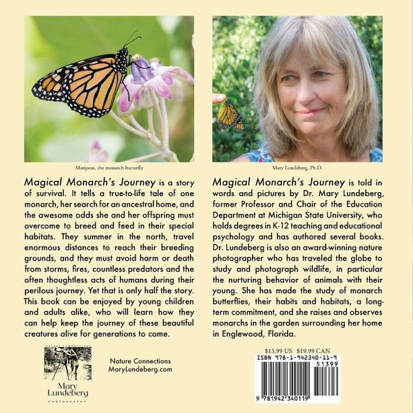 Magical Monarch's Journey is a story of survival. It tells a true-to-life tale of one monarch, her search for an ancestral home, and the awesome odds she and her offspring must overcome to breed and feed in their special habitats. They summer in the north, travel enormous distances to reach their breeding grounds, and they must avoid harm or death from storms, fires, countless predators, and the often thoughtless acts of humans during their perilous journey. Yet that is only half the story. Magical Monarch's Journey can be enjoyed by young children and adults alike, who will learn how they can help keep the journey of these beautiful creatures alive for generations to come.