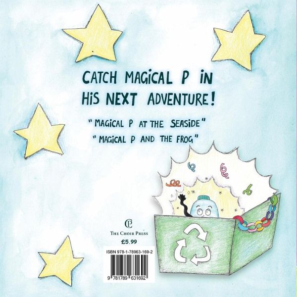 Magical P is a fun, adventure story book aimed at two to five-year-olds as a family, nursery or school shared read. An adventure story around a magical plastic bottle, who once recycled can reappear for more and more adventures. Using young children's wonderful make-believe imagination, it encourages the idea of using a recycling bin, in fact the bin is Magical P's bed which he needs to return to after each adventure. The story introduces the idea of the importance of recycling in a light hearted and fun way. Magical P has a lots of adventures with his friends Crinkley C (a tin can), Perfect P ( made of paper), Strong C (cardboard) and there are more to come! This story about a magic bottle introduces young children to the concept of recycling plastic.