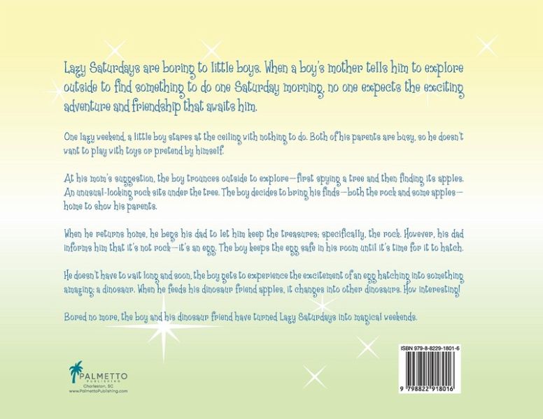 Lazy Saturdays are boring to little boys. When a boy's mother tells him to explore outside to find something to do one Saturday morning, no one expects the exciting adventure and friendship that awaits him. One lazy weekend, a little boy stares at the ceiling with nothing to do. Both of his parents are busy, so he doesn't want to play with toys or pretend by himself. At his mom's suggestion, the boy trounces outside to explore-first spying a tree and then finding its apples. An unusual-looking rock sits under the tree. The boy decides to bring his finds-both the rock and some apples-home to show his parents. When he returns home, he begs his dad to let him keep the treasures; specifically, the rock. However, his dad informs him that it's not rock-it's an egg. Soon, the boy gets to experience the excitement of an egg hatching into something amazing: a dinosaur. When he feeds his dinosaur friend apples, it changes into other dinosaurs. Bored no more, the boy and his dinosaur friend have turned Lazy Saturdays into magical weekends. Magical Saturday is a great pick for early readers and young children with parents or guardians who can read it to them. They'll enjoy the themes of friendship, exploration, and courage to experience new things.