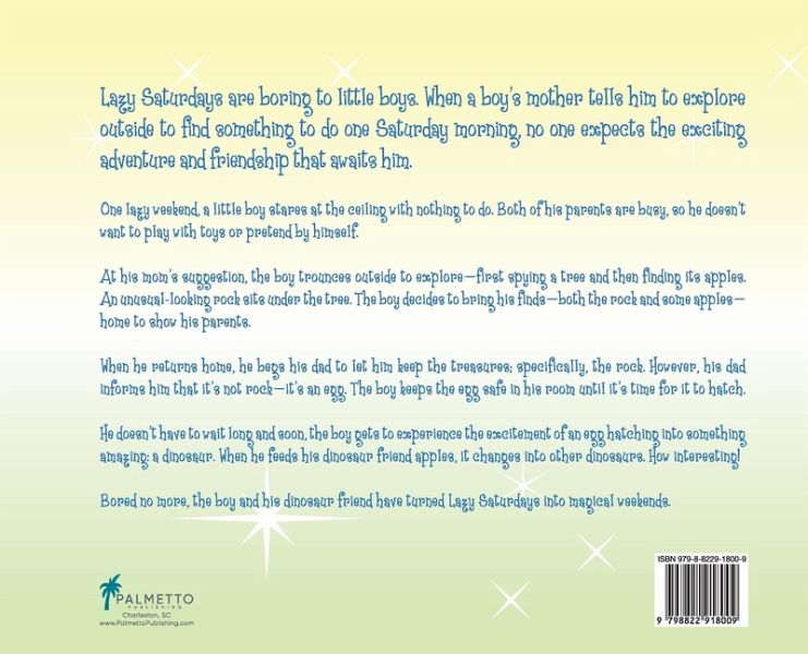 Lazy Saturdays are boring to little boys. When a boy's mother tells him to explore outside to find something to do one Saturday morning, no one expects the exciting adventure and friendship that awaits him. One lazy weekend, a little boy stares at the ceiling with nothing to do. Both of his parents are busy, so he doesn't want to play with toys or pretend by himself. At his mom's suggestion, the boy trounces outside to explore-first spying a tree and then finding its apples. An unusual-looking rock sits under the tree. The boy decides to bring his finds-both the rock and some apples-home to show his parents. When he returns home, he begs his dad to let him keep the treasures; specifically, the rock. However, his dad informs him that it's not rock-it's an egg. Soon, the boy gets to experience the excitement of an egg hatching into something amazing: a dinosaur. When he feeds his dinosaur friend apples, it changes into other dinosaurs. Bored no more, the boy and his dinosaur friend have turned Lazy Saturdays into magical weekends. Magical Saturday is a great pick for early readers and young children with parents or guardians who can read it to them. They'll enjoy the themes of friendship, exploration, and courage to experience new things.