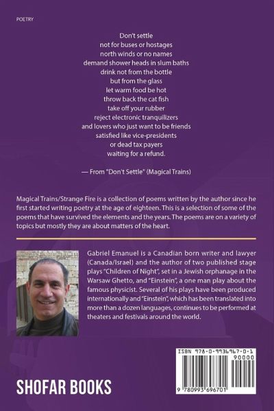 Don't settle not for buses or hostages north winds or no names demand shower heads in slum baths drink not from the bottle but from the glass let warm food be hot throw back the cat fish take off your rubber reject electronic tranquilizers and lovers who just want to be friends satisfied like vice-presidents or dead tax payers waiting for a refund. -From "Don't Settle" (Magical Trains) Magical Trains/Strange Fire is a collection of poems written by the author since he first started writing poetry at the age of eighteen. This is a selection of some of the poems that have survived the elements and the years. The poems are on a variety of topics but mostly they are about matters of the heart. Gabriel Emanuel is a Canadian born writer and lawyer (Canada/Israel) and the author of two published stage plays "Children of Night", set in a Jewish orphanage in the Warsaw Ghetto, and "Einstein", a one man play about the famous physicist.