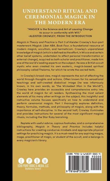 Understand Ritual and Ceremonial Magick in the Modern Era "MAGICK is the Science and Art of causing Change to occur in conformity with Will." -Aleister Crowley, from the Introduction Magick in Theory and Practice is Part 3 of Aleister Crowley's four-part masterwork Magick: Liber ABA, Book Four, a foundational resource of modern magick, occultism, and hermeticism. Crowley's unparalleled knowledge of magick (which is defined as the effort, in Wicca and certain other belief systems, undertaken to affect personal transformation or external change), acquired as both scholar and practitioner, made him one of the world's leading experts on the subject. He was a British occult mystic who even created his own esoteric, magick-based spiritual philosophy called Thelema, for which he wrote the sacred texts. In Crowley's broad view, magick represents the act of affecting the world through thoughts and actions. Often known for his sensational teachings and self-created diabolical image (he was infamously known, in his own words, as "the Wickedest Man in the World!"), Crowley here provides an accessible and comprehensive entry into the world of magick for all readers. Synthesizing the most salient elements of his many other writings on the subject, this insightful and instructive volume focuses specifically on how to understand and perform ceremonial magick. Part 1 thoroughly explores definition, theory, formulas, methods, and philosophy of magick, along with the importance of self-discipline. In the second half, Crowley illuminates and provides instructions for several of the most significant magical rituals, including the Star Ruby banishing. Replete with useful advice, copious footnotes, and a comprehensive bibliography, Magick in Theory and Practice includes helpful instructions for creating conducive mindsets and appropriate physical settings for practicing magick. It is a must-read for any aspiring magus, mage, practitioner of magic, or student of the occult, and a belongs in every magician's library. This book is also available from Echo Point Books as a paperback (ISBN 1648370101).
