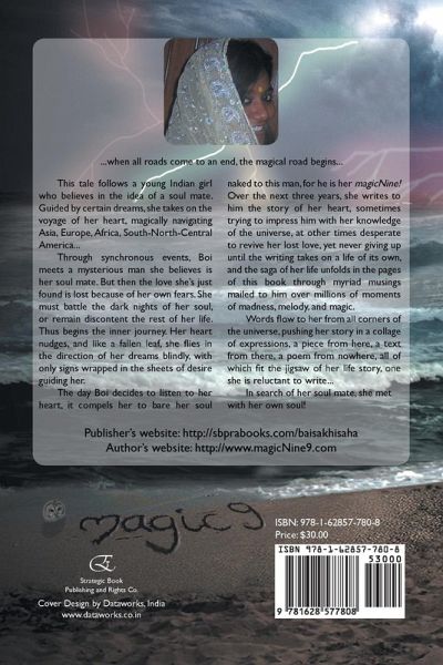 ...when all roads come to an end, the magical road begins... This tale follows a young Indian girl who believes in the idea of a soul mate. Guided by certain dreams, she takes on the voyage of her heart, magically navigating Asia, Europe, Africa, South-North-Central America... Through synchronous events, Boi meets a mysterious man she believes is her soul mate. But then the love she's just found is lost because of her own fears. She must battle the dark nights of her soul, or remain discontent the rest of her life. Thus begins the inner journey. Her heart nudges, and like a fallen leaf, she flies in the direction of her dreams blindly, with only signs wrapped in the sheets of desire guiding her. The day Boi decides to listen to her heart, it compels her to bare her soul naked to this man, for he is her magicNine! Over the next three years, she writes to him the story of her heart, sometimes trying to impress him with her knowledge of the universe, at other times desperate to revive her lost love, yet never giving up until the writing takes on a life of its own, and the saga of her life unfolds in the pages of this book through myriad musings mailed to him over millions of moments of madness, melody, and magic. Words flow to her from all corners of the universe, pushing her story in a collage of expressions, a piece from here, a text from there, a poem from nowhere, all of which fit the jigsaw of her life story, one she is reluctant to write... In search of her soul mate, she met with her own soul! Publisher's website: http://sbprabooks.com/baisakhisaha Author's website: http://www.magicNine9.com
