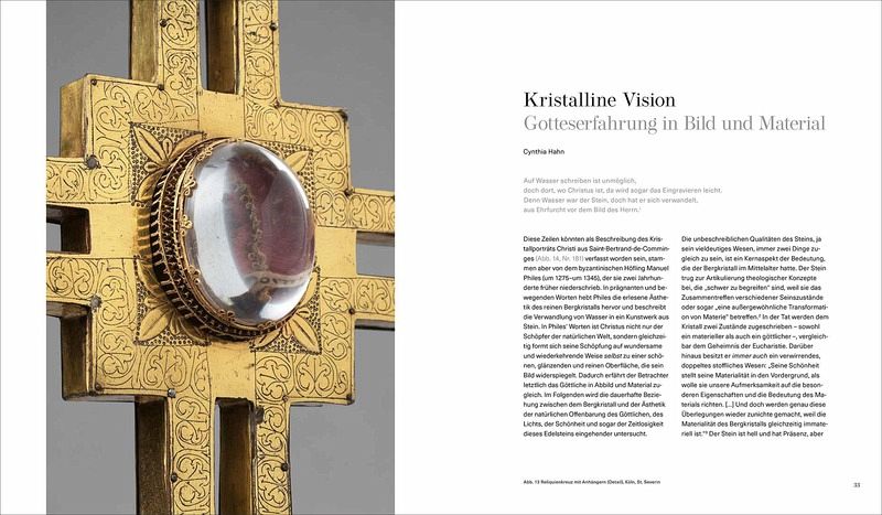Lange nahm man an, es handele sich bei Bergkristall um zu ewigem Eis erstarrtes Wasser, und fertigte Objekte mit der Aura des Göttlichen daraus. Von der Antike bis zum ausgehenden Mittelalter reicht die Bandbreite der Werke von Gefäßen für Heiliges und Profanes über Kreuze, Schachspiele, Amulette, Kühlkugeln bis zu Amtszeichen und Lupen. Die Facetten des Materials Bergkristall, seine Bearbeitung, Verwendung und symbolische Ausdeutung werden aus der Perspektive von Kunst, Mineralogie, Archäologie, Philologie und Optik beleuchtet.