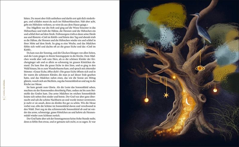 Viele besonders detailreiche Illustrationen auf jeder Seite erwecken die Erzählungen auf magische Weise zum Leben. Kunstvoll illustrierte Kapitelaufmacher und aufwändig gestaltete Schmuckseiten setzen jede der Geschichte ganz individuell in Szene und machen das Lesen zu einem außergewöhnlichen Abenteuer. Eine beidseitig aufklappbare, großflächig illustrierte Doppelseite in der Buchmitte versammelt Motive aus allen Märchen in einem großen Wald-Wimmelbild und lädt zum Schauen und Staunen ein. Der edle Einband in Leinenhaptik, der Goldschnitt und die hochwertige Goldfolienveredelung auf dem Cover machen das Buch zu einem ganz besonderen Geschenk für alle Märchenfans und Waldliebhaber - zum Vorlesen, Selbstlesen und Verschenken.