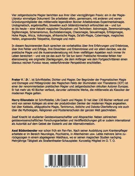 Vier zeitgenössische Magier berichten aus ihrer über vierzigjährigen Praxis: ein in der Magie-Literatur einmaliges Dokument! Sie arbeiteten allein, gemeinsam, mit anderen und waren Gründungsmitglieder des mittlerweile legendären Bonner Arbeitskreises Experimentalmagie. Undogmatisch, ergebnisoffen, bisweilen auch bilderstürmerisch erforschten sie - und tun es bis heute - eine Vielzahl magischer Disziplinen und Techniken: Astromagie, Zeremonialmagie, Sigillenmagie, Schamanismus, Buchstabenmagie, Chaosmagie, Sexualmagie, Erfolgsmagie, Hohe Magie, Wicca, Volksmagie, afrikanische Magie,…mehr
