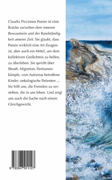 Claudia Piccinnos Poesie ist eine Brücke zwischen dem inneren Bewusstsein und der Randständigkeit unserer Zeit. Sie glaubt, dass Poesie wirklich eine Art Zeugnis ist, aber auch ein Mittel, um dem kollektiven Gedächtnis zu helfen, zu überleben. Sie spricht über Shoah, Migration, Partisanenkämpfe, vom Autismus betroffene Kinder, onkologische Patienten ... Sie hilft uns, die Fremden zu verstehen, die in uns leben. Und zeigt uns auch die Suche nach einem Gleichgewicht.