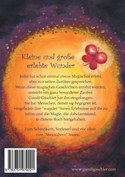 Kleine und große erlebte Wunder. Jeder hat schon einmal etwas Magisches erlebt, aber nur selten darüber gesprochen. Wenn diese magischen Geschichten erzählt werden, entsteht ein ganz besonderer Zauber. Gundi Gaschler hat ihn eingefangen. Sie hat Menschen, denen sie begegnet ist, eingeladen ihre "wunder"-baren Erlebnisse mit ihr zu teilen und die Magie, die dabei entstand, in diesem Buch festgehalten.Zum Schmökern, Vorlesen und vor allem zum "Verzaubern" lassen.