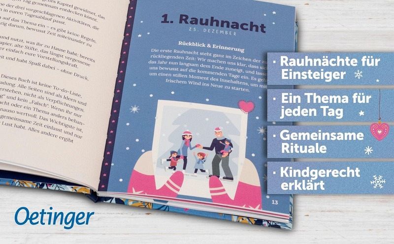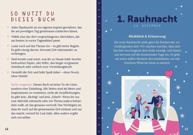 Rauhnächte für Anfänger: Dieses Buch begleitet Erwachsene und Kinder ganz unkompliziert durch die ersten Erlebnisse mit den Rauhnächten. Zwölf Nächte, zwölf Themen: Jeder Tag befasst sich ganz bewusst mit einem bestimmten Anlass für einen achtsameren Alltag und die Stärkung der Verbindung zwischen Eltern und Kind. Wünsche und Erfahrungen: Vorschläge, Anleitungen und Rituale für die Rauhnächte warten auf Familien, die die Zeit zwischen den Feiertagen zum gemeinsamen Ausklingen nutzen möchten. Zeitlich flexibel: Das Rauhnächte-Buch bietet unterschiedlich lange und altersgerechte Mitmach-Übungen um eine besinnliche Zeit für Kinder und ihre Angehörigen zu gestalten.