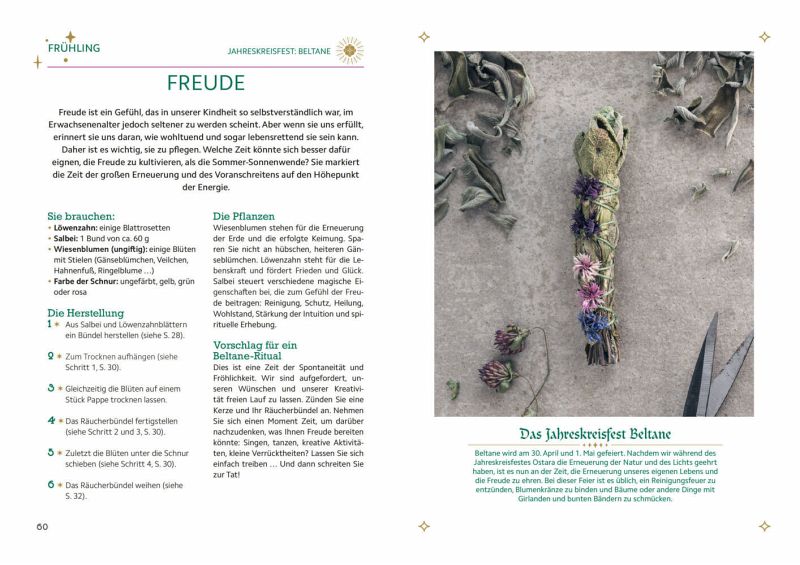 beruhigt und dient der ReinigungSchritt für Schritt zum eigenen Räucherritual: Pflanzen sammeln, Räucherbündel binden und trocknen, weihen und anwendenMit Saisonkalender überalle Pflanzen und Kräuter und deren besondere KräfteBeifuß dient dem Schutz, Basilikum beruhigt, Rose ist ein Aphrodisiakum, Salbei reinigt, Wiesenklee fördert das Glück uvm.Räucherrituale zu Hexenfesten, zum energetischen Reinigen, zur Lösung von Blockaden, zum Schutz- und Liebeszauber oder zur Befreiung der Weiblichkeit