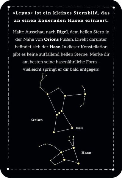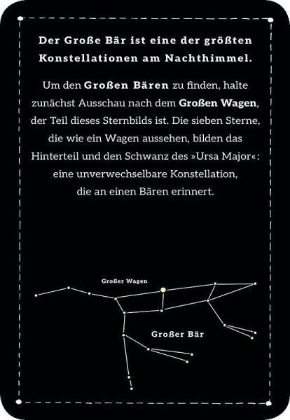 Das Set besteht aus 30 Karten sowie einem praktischen Leporello und ist wunderschön illustriert. Jede Karte stellt ein Sternbild, einen Planeten oder einen Himmelskörper vor und enthält einen kurzen Infotext, der die wichtigsten Fakten leicht verständlich erklärt. Diese Texte wurden von einer leitenden NASA-Wissenschaftsjournalistin verfasst und verbinden wissenschaftliche Genauigkeit mit kindgerechter Sprache.