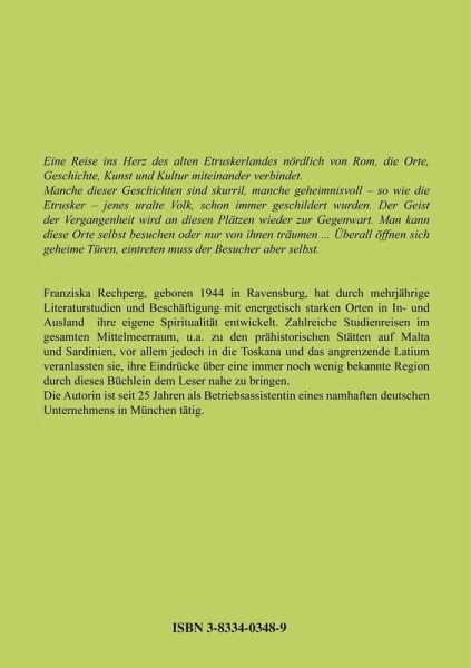 Die meisten kennen Italien und viele die Toskana. Aber wo liegt Etrurien? Gemeint ist damit das Gebiet nördlich von Rom an der Grenze zur Toskana. Hier war einst das Kernland der Etrusker, jenes Volkes, das noch vor den Römern die erste Hochkultur in Italien hervorbrachte. In ihrem Buch erzählt die Autorin von Streifzügen durch diese fast unbekannte Region, in der die Vergangenheit noch allgegenwärtig ist. Ihre Geschichten sind teilweise geheimnisvoll, manchmal auch skurril. Im Mittelpunkt steht der Geist Etruriens. Er verbindet die Vergangenheit mit der Gegenwart und erzählt von einem uralten Volk, das in dieser Landschaft immer noch lebt, auch wenn es längst untergegangen ist.