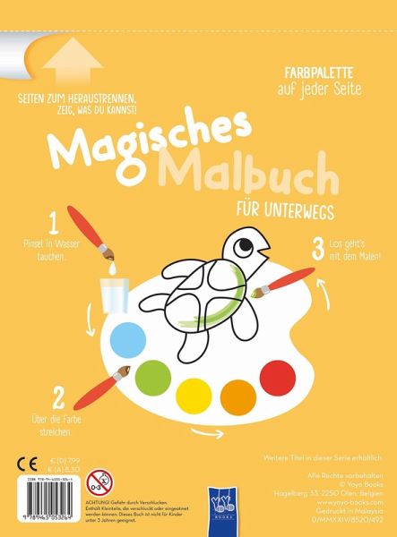 Malbuch mit integriertem Pinsel und Farbpalette auf jeder Seite. Ausmalen war noch nie so einfach wie mit diesem All-in-One Malbuch! Einfach den Pinsel in Wasser tauchen, eine Farbe aus der Farbpalette auf der Seite auswählen, mit dem nassen Pinsel darüberwischen und schon sind dem Malspaß keine Grenzen mehr gesetzt. Jedes der Bilder kann an der Perforation abgetrennt und mit einer Widmung versehen werden. Das handliche Format ist praktisch für unterwegs oder für Reisen.