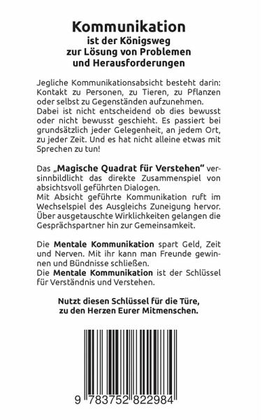Kommunikation ist der Königsweg zur Lösung von Problemen und Herausforderungen.Jegliche Kommunikationsabsicht besteht darin: Kontakt zu Personen, zu Tieren, zu Pflanzen oder selbst zu Gegenständen aufzunehmen.Dabei ist nicht entscheidend, ob dies bewusst oder nicht bewusst geschieht. Es passiert bei grundsätzlich jeder Gelegenheit, an jedem Ort, zu jeder Zeit. Und es hat nicht alleine etwas mit Sprechen zu tun!Das Magische Quadrat für Verstehen versinnbildlicht das direkte Zusammenspiel von absichtsvoll geführten Dialogen.Mit Absicht geführte Kommunikation ruft im Wechselspiel des Ausgleichs Zuneigung hervor. Über ausgetauschte Wirklichkeiten gelangen die Gesprächspartner hin zur Gemeinsamkeit.Die Mentale Kommunikation spart Geld, Zeit und Nerven. Mit ihr kann man Freunde gewinnen und Bündnisse schließen.Die Mentale Kommunikation ist der Schlüssel für Verständnis und Verstehen.Nutzt diesen Schlüssel für die Türe, zu den Herzen Eurer Mitmenschen.