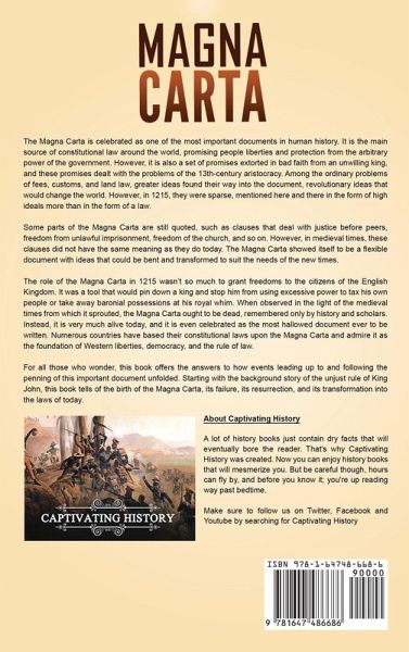 If you want to discover the captivating history of the Magna Carta, then keep reading... The Magna Carta is celebrated as one of the most important documents in human history. It is the main source of constitutional law around the world, promising people liberties and protection from the arbitrary power of the government. However, it is also a set of promises extorted in bad faith from an unwilling king, and these promises dealt with the problems of the 13th-century aristocracy. Among the ordinary problems of fees, customs, and land law, greater ideas found their way into the document, revolutionary ideas that would change the world. However, in 1215, they were sparse, mentioned here and there in the form of high ideals more than in the form of a law. Some parts of the Magna Carta are still quoted, such as clauses that deal with justice before peers, freedom from unlawful imprisonment, freedom of the church, and so on. However, in medieval times, these clauses did not have the same meaning as they do today. The Magna Carta showed itself to be a flexible document with ideas that could be bent and transformed to suit the needs of the new times. In Magna Carta: A Captivating Guide to the History of the Great Charter and its Influence on Medieval England and the Rest of the World, you will discover topics such as King John The Path to Runnymede The Magna Carta The Failure of the Magna Carta The War The Regent and the End of the First Barons’ War Henry III and the Magna Carta Second Barons’ War and Edward I The Late Medieval Period and the Tudors The Revival of the Magna Carta The New World and the Magna Carta So if you want to learn more about the Magna Carta, scroll up and click the "add to cart" button!