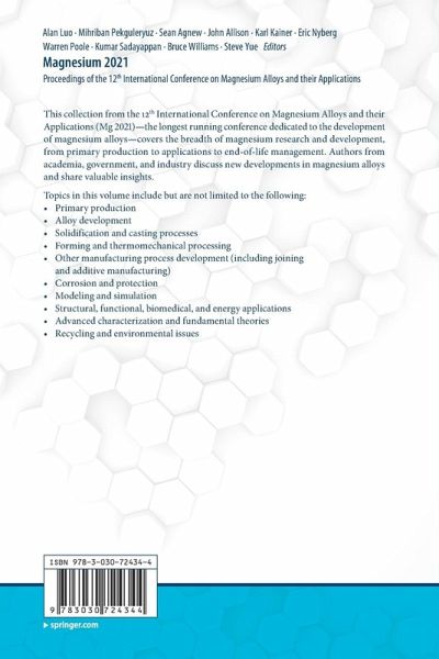 Topics in this volume include but are not limited to the following: Primary production Alloy development Solidification and casting processes Forming and thermo-mechanical processing Other manufacturing process development (including joining and additive manufacturing) Corrosion and protection Modeling and simulation Structural, functional, biomedical, and energy applicationsAdvanced characterization and fundamental theoriesRecycling and environmental issues