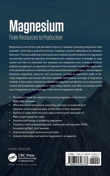 Magnesium is one of the most abundant minerals in seawater. Extracting magnesium from seawater could reduce cost of this mineral, resulting in positive implications for industries that use it. This book addresses mineral process engineering with emphasis on magnesium and provides practicing engineers and students with comprehensive knowledge on magnesium and how it is extracted from seawater and magnesium ores. It takes a chemical engineering approach as separation of magnesium from seawater involves the application of the powerful science of chemistry and transport phenomena principles. This monograph discusses magnesium resources and occurrence, includes an exploration study on deriving magnesium and mineral salts from seawater, and features coverage of magnesium chloride. It also covers commercial methods for magnesium production as an end product, current and prospective applications in the energy domain, and offers an account of the use of magnesium to store hydrogen in the form of magnesium hydride.