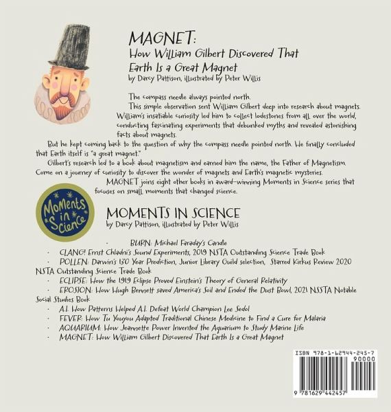The compass needle always pointed north. This simple observation sent William Gilbert deep into research about magnets. William's insatiable curiosity led him to collect lodestones from all over the world, conducting fascinating experiments that debunked myths and revealed astonishing facts about magnets. But he kept coming back to the question of why the compass needle pointed north. He finally concluded that Earth itself is "a great magnet." Gilbert's research led to a book about magnetism and earned him the name, the Father of Magnetism. Come on a journey of curiosity to discover the wonder of magnets and Earth's magnetic mysteries. MAGNET joins eight other books in award-winning Moments in Science series that focuses on small moments that changed science. MOMENTS IN SCIENCE SERIES by Darcy Pattison, illustrated by Peter Willis This exciting series focuses on small moments in science that made a difference. The first six books have been translated into Korean. · BURN: Michael Faraday's Candle · CLANG! Ernst Chladni's Sound Experiments, 2019 NSTA Outstanding Science Trade Book · POLLEN: Darwin's 130 Year Prediction, Junior Library Guild selection, Starred Kirkus Review 2020 NSTA Outstanding Science Trade Book · ECLIPSE: How the 1919 Eclipse Proved Einstein's Theory of General Relativity · EROSION: How Hugh Bennett saved America's Soil and Ended the Dust Bowl, 2021 NSSTA Notable Social Studies Book · A.I. How Patterns Helped A.I. Defeat World Champion Lee Sedol · FEVER: How Tu Youyou Adapted Traditional Chinese Medicine to Find a Cure for Malaria · AQUARIUM: How Jeannette Power Invented the Aquarium to Study Marine Life · MAGNET: How William Gilbert Discovered That Earth Is a Great Magnet