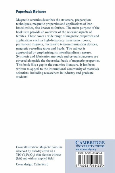 Magnetic ceramics describes the structure, preparation techniques, magnetic properties and applications of iron-based oxides, also known as ferrites. The main purpose of the book is to provide an up-to-date overview of the relevant aspects of ferrites. These cover a wide range of magnetic properties and applications such as high-frequency transformer cores, permanent magnets, microwave telecommunication devices, magnetic recording tapes and heads. The subject is approached by emphasising its interdisciplinary nature. Synthesis and fabrication methods and crystal structures are covered alongside the theoretical basis of magnetic properties. This is a much needed book which fills a gap in the ceramics literature. It has been written to appeal to the international community of materials scientists, including researchers in industry and graduate students.