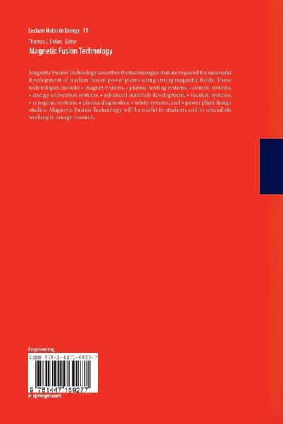 Magnetic Fusion Technology describes the technologies that are required for successful development of nuclear fusion power plants using strong magnetic fields. These technologies include: - magnet systems, - plasma heating systems, - control systems, - energy conversion systems, - advanced materials development, - vacuum systems, - cryogenic systems, - plasma diagnostics, - safety systems, and - power plant design studies. Magnetic Fusion Technology will be useful to students and to specialists working in energy research.